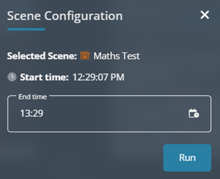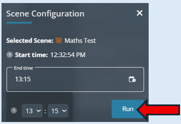 This will open an additional options box. This will ask you to select a time that the scene will end. We would recommend that the latest this is set at is the time the session/lesson is due to end. As a default the time will always show 60 minutes from the time the scene was selected.
