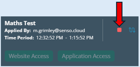 You will see the title of the scene, who has applied the scene and the time period that it will be running for. If you wish to close the scene prior to the set time you can click the ‘Stop Scene’ Icon.
